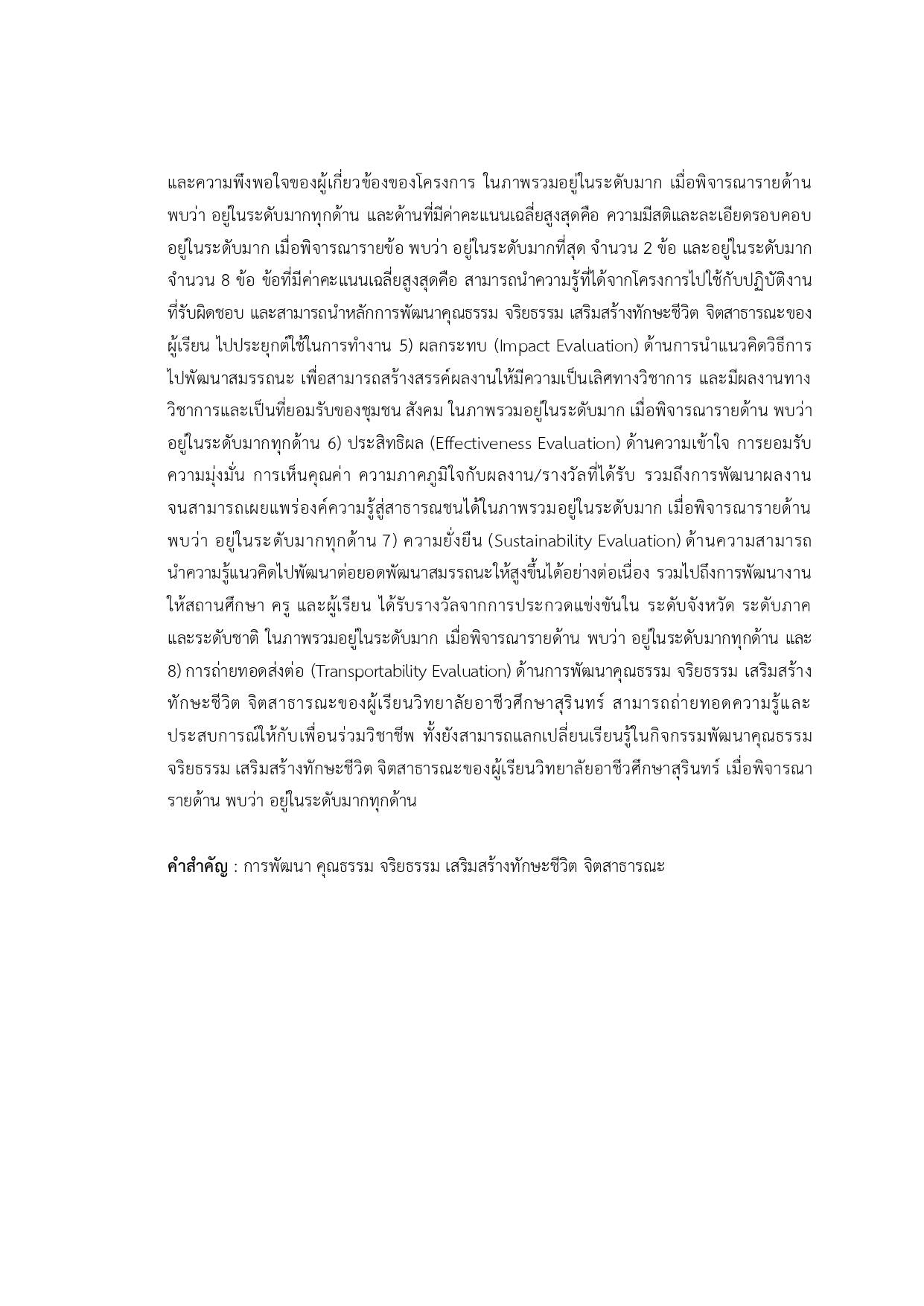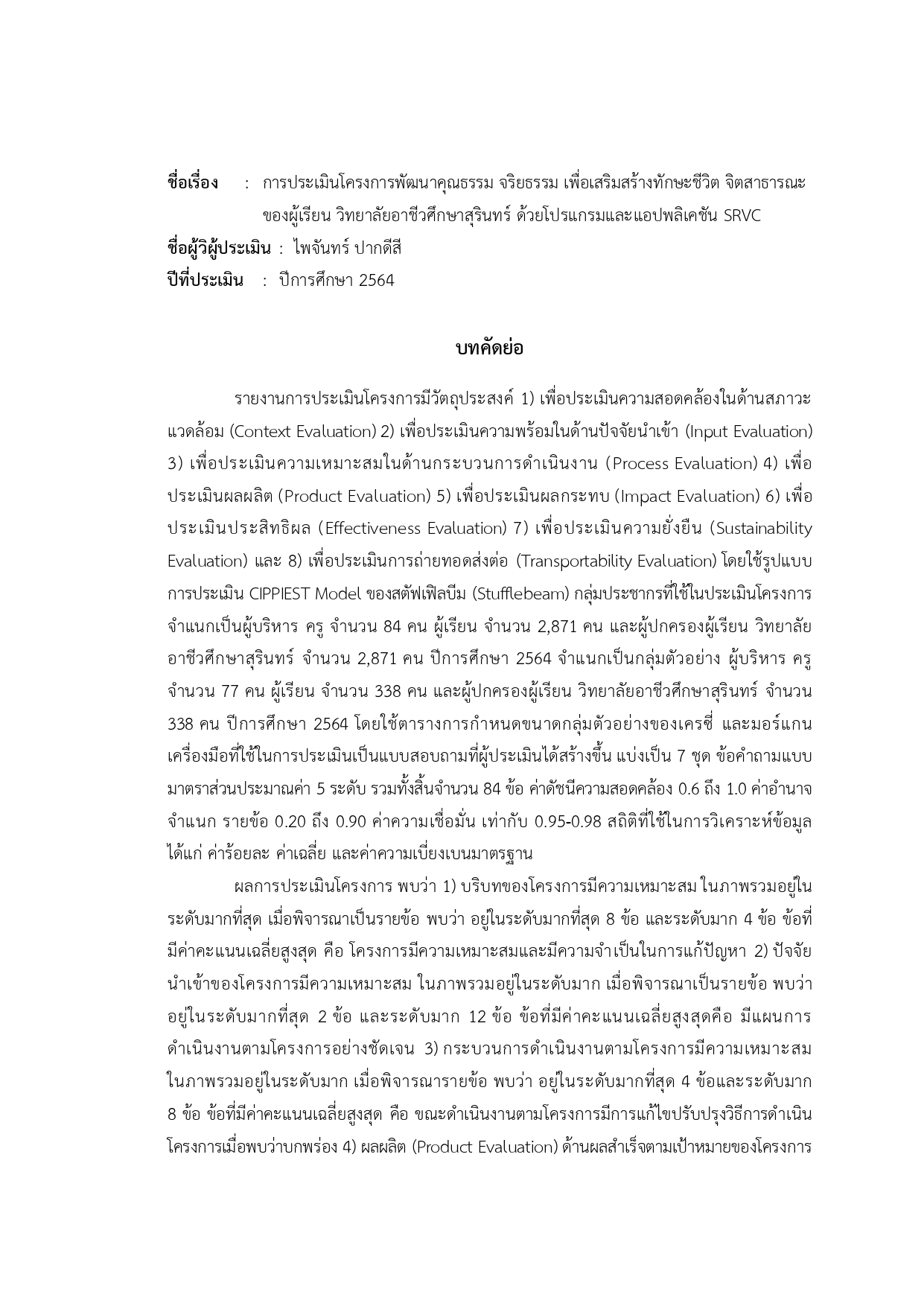 การประเมินโครงการพัฒนาคุณธรรม จริยธรรม เพื่อเสริมสร้างทักษะชีวิต จิตสาธารณะ ของผู้เรียน ด้วยโปรแกรมและแอปพลิเคชั่น SRVC